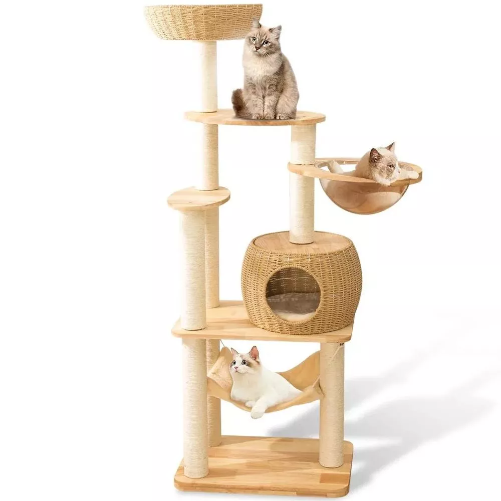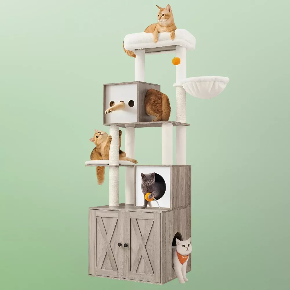 Designed to keep your cats entertained and active, this tower includes a spacious condo for restful privacy, a large and small hammock for lounging, and fun hanging & spring pompom balls to spark their playful instincts. With six sisal-covered scratching posts placed at different heights, your cats can stretch and scratch freely while keeping their claws healthy. Please note: the transparent acrylic nest shown in images is sold separately.