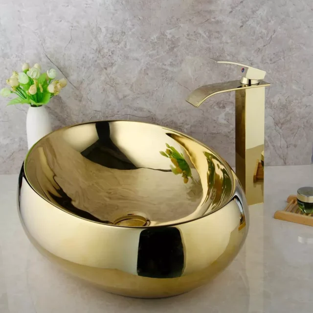 This vessel sink set is the perfect addition to any modern bathroom, providing a sophisticated touch with its beautiful gold-trimmed design. The smooth, oval shape and premium ceramic material offer durability and an upscale appearance. Whether you’re remodeling or building a new bathroom, this sink is the ideal choice for a clean, contemporary look.