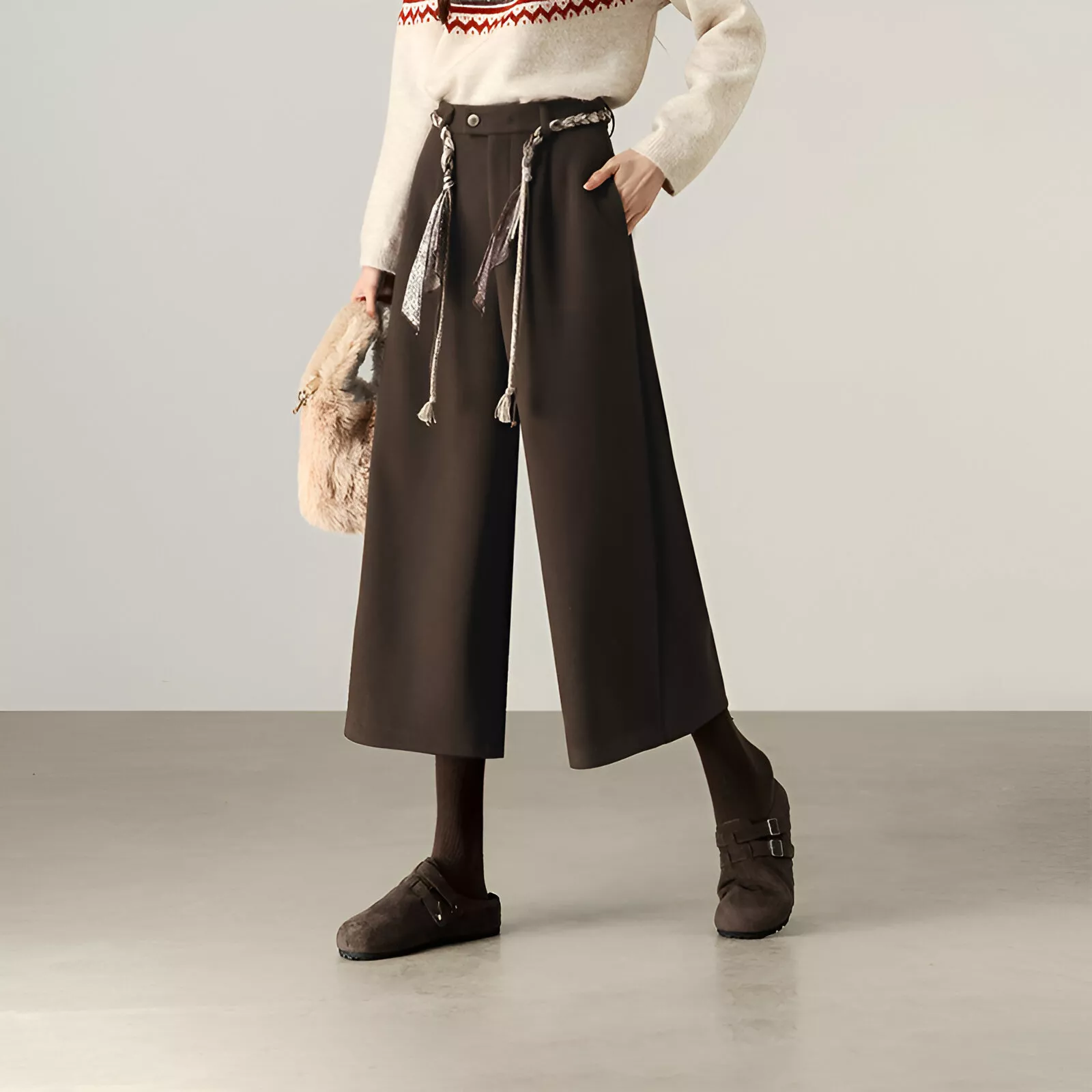 Made from a soft blended fabric of cotton and polyester, these ankle-length pants offer medium stretch for easy movement and all-day wear. Their smooth knit texture gives them a polished look while the wide-leg cut provides a graceful drape. The elastic waist makes dressing effortless, and the convenient side pockets add the functionality you need for daily life. These features make the pants ideal for autumn and winter—perfect for pairing with sweaters, coats, or fitted tops.