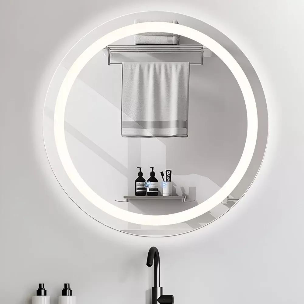 Transform your bathroom into a personal sanctuary with this stunning Round LED Bathroom Mirror. Measuring 31.5″ in diameter, it combines modern design with cutting-edge technology to elevate your daily routine. Its sleek wall-mounted silhouette fits beautifully in any bathroom, guest suite, or vanity area, creating a perfect blend of luxury and practicality. With front-lit illumination and RGB backlighting, this mirror delivers flawless clarity and customizable ambiance every time you turn it on.