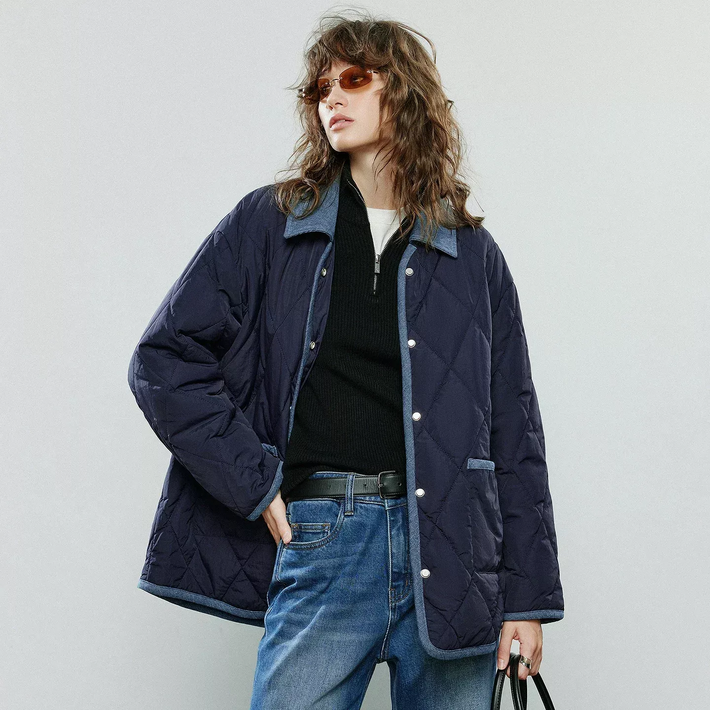 What sets this jacket apart is its balance of comfort and style. The down filling provides efficient warmth without excess weight, making it easy to move throughout your day. The refined patchwork finish adds visual texture without being overpowering, giving it a versatile look that works in both professional and casual settings. The hood adds practical protection while enhancing the overall cozy look.